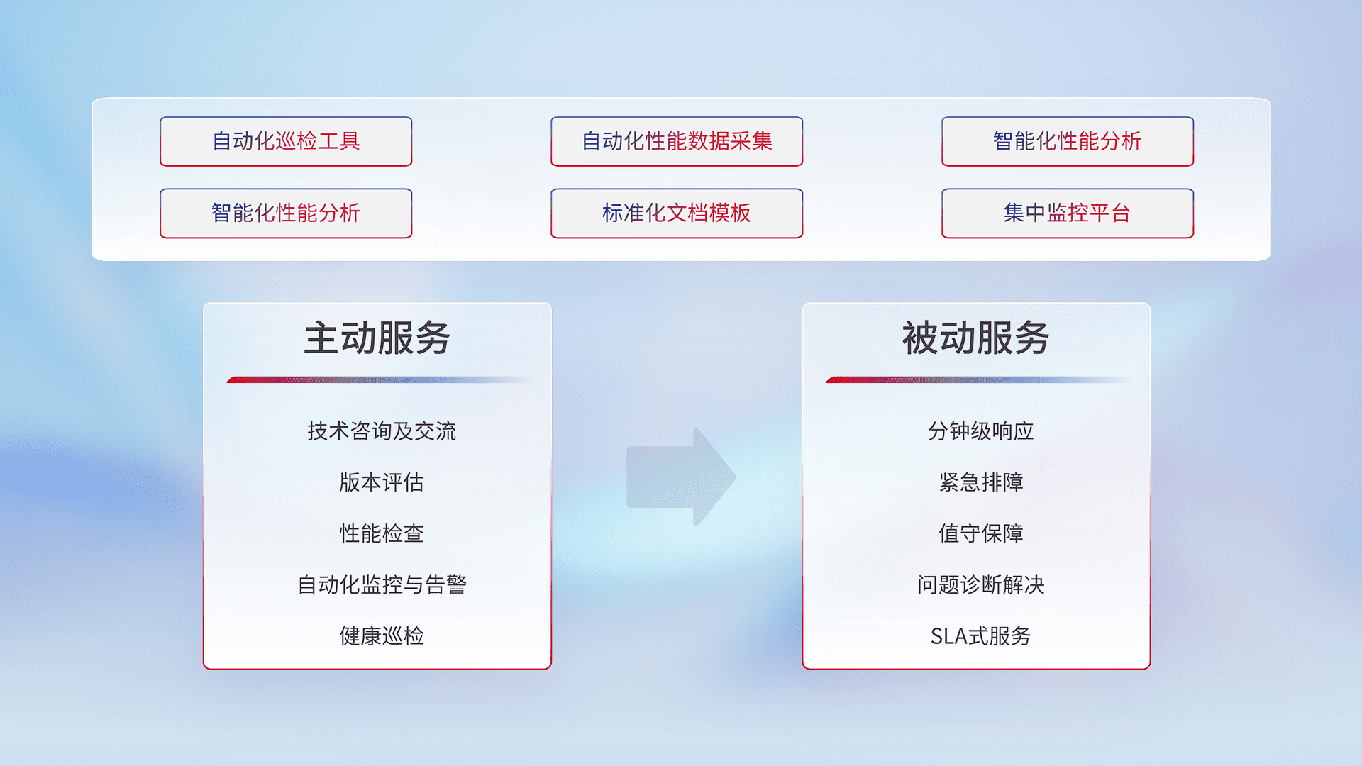 智能化工具和标准化文档,,,,保障服务质量,,,提供主动服务(包含技术咨询、、、版本评估、、性能检查、、自动化监控与告警、、健康巡检)和被动服务包含(分钟级响应、、、紧急排障、、、、值守保障、、、、问题诊断解决、、、SLA服务)。。